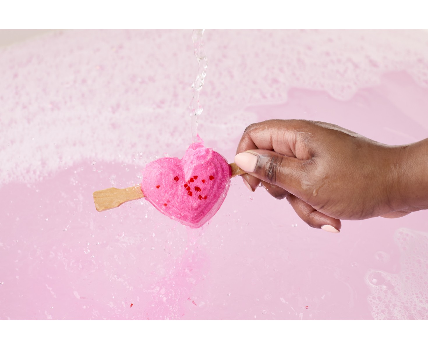 Стави ја твојата повторно употреблива пенлива купка под млаз вода за планини од романтични меурчиња со роза.